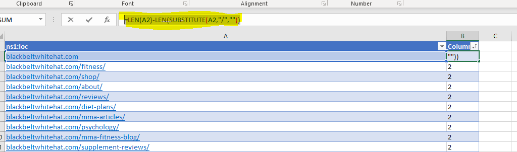12. You can now order column B by the number of “/” found in each URL
