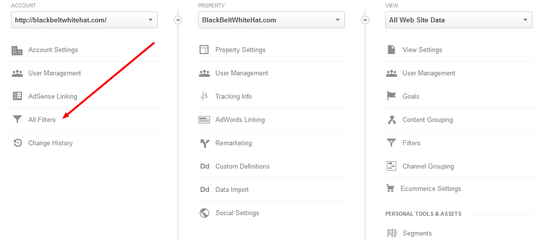 Once a new view is created; on the right-hand-side of the Admin page, click “Filters”