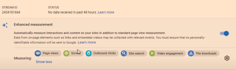 Click on data stream and check to see that “Enhanced Measurement” is switched to the on position. If you click on the cog icon, you can then switch different measurements on and off.