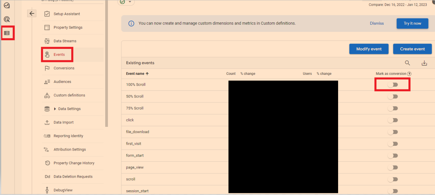 in the configure section, you can mark events as conversions, create audiences , set up custom dimensions and metrics, and access the debug view to test you’ve implemented stuff correctly.