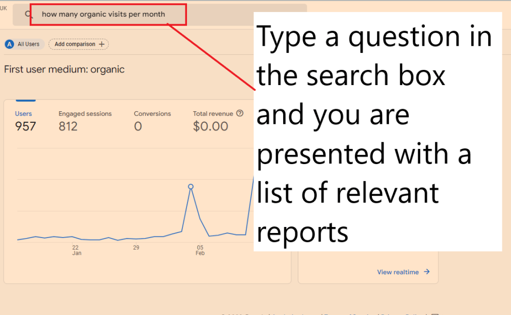 The new version of Google Analytics – Google Analytics 4 – has less pre-made reports and users are prompted to customise their own dashboards and use the search function.