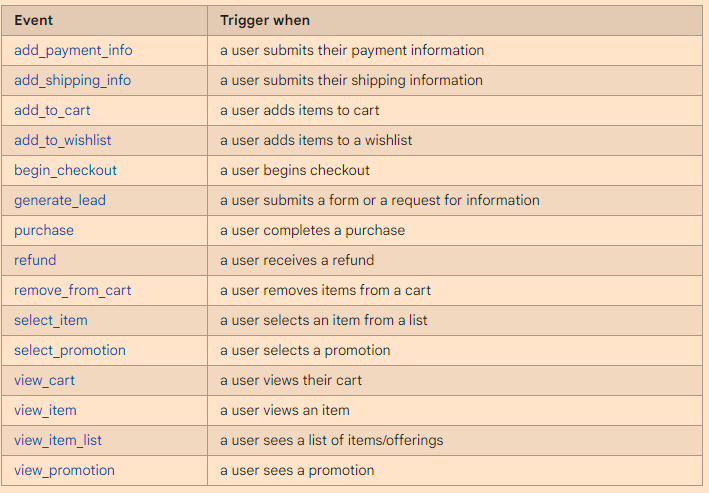 Google provides a list of recommended events for all websites and apps, and then by industry.