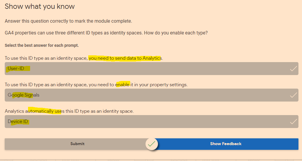 When trying to understand user journeys, Analytics can use several different user identifiers, such as the IDs you assign users logged into your website, Google signals, and device ID. These groups of identifiers are called identity spaces.