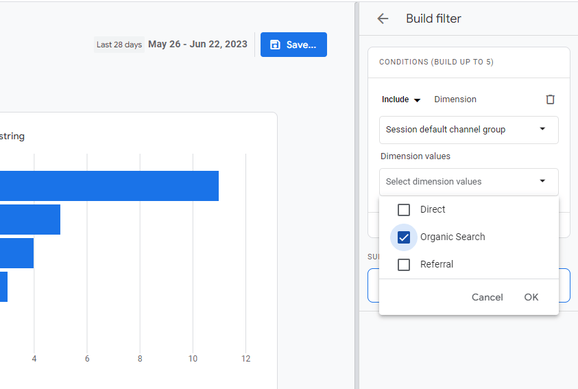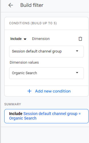 Reports – Acquisition – Engagement – Pages and screens – Add a filter by clicking top right “+” button Search for “session” and choose session default channel group – exactly matches – Organic search: