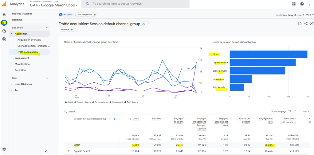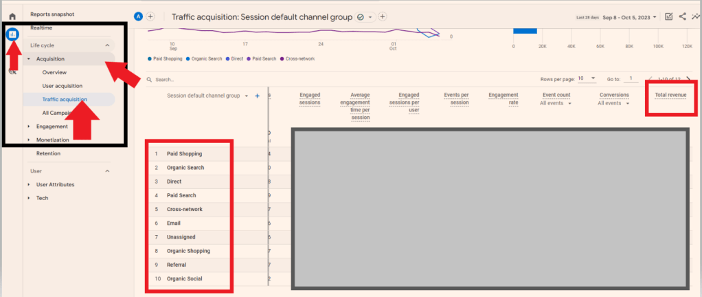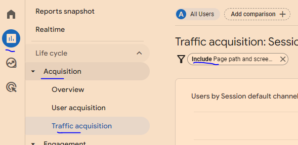 the traffic acquisition report let’s you see how engaged different source s of traffic are. For example, you can compare organic engagement rate vs paid ads.