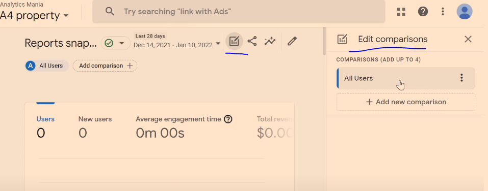 You can add comparisons, by clicking “Add comparison +” at the top, or by clicking the “edit comparisons” icon which is near the top right: