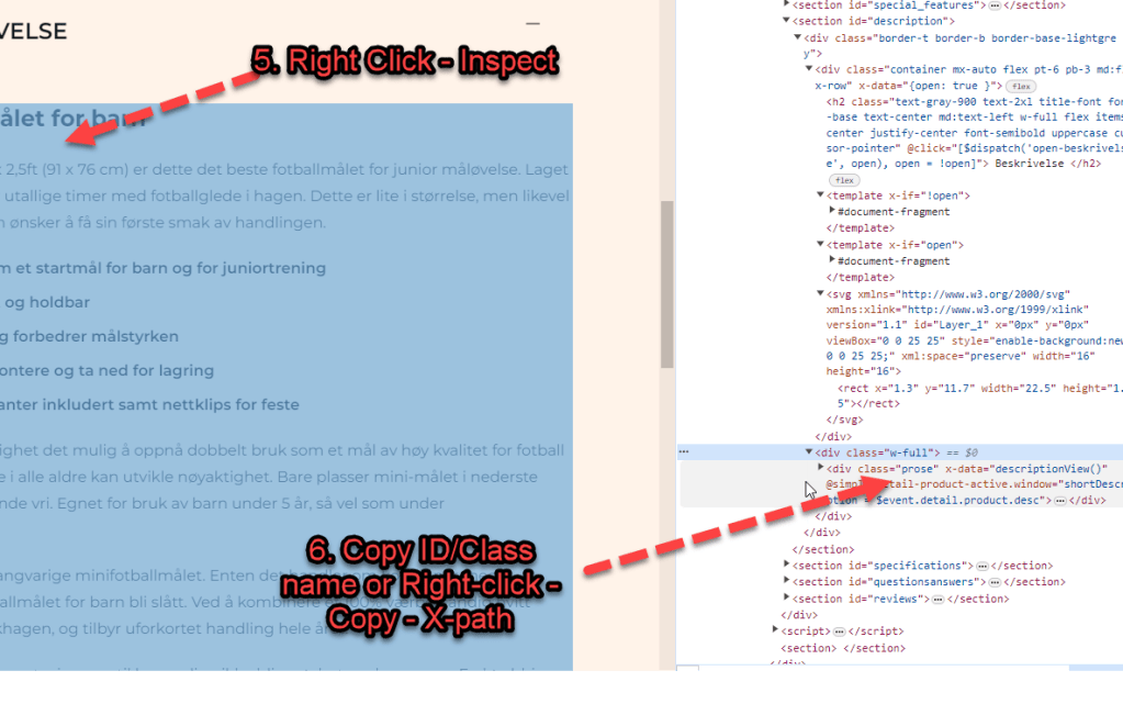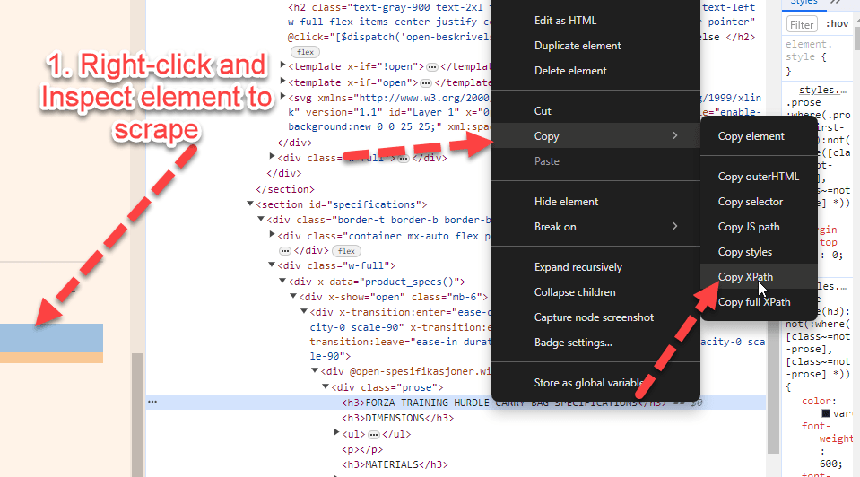 If the ‘shorter code’ in the tables above doesn’t work for some reason, you may have to right click – inspect and copy the full Xpath code to be more specific with what you want to extract: