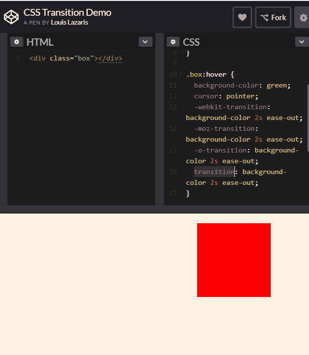 In the example above, we transition the background colour, over 2 seconds and tell it to “ease out”