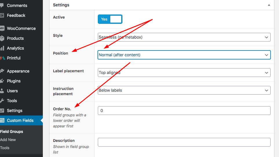 Most items are quite straight forward – the Location part is very important thought – as this dictates on which pages or posts, this field will appear. For my wooCommerce store, I have chosen: Post Type – is equal to – product so that I get the text field on all my product posts.