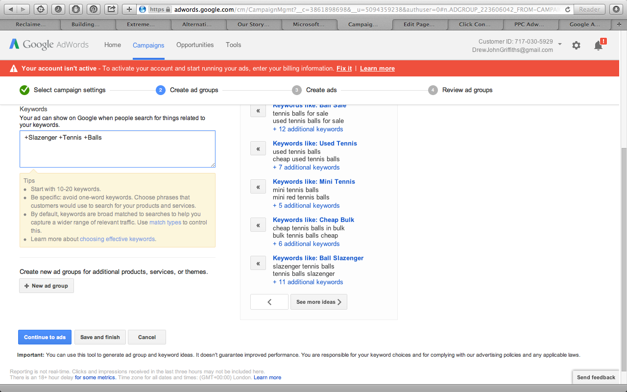 Look out for the longer phrases. For example “tennis balls” may be an expensive keyword to bid on, but a more specific keyword like “used Slazenger yellow tennis balls” may cost less to bid on.